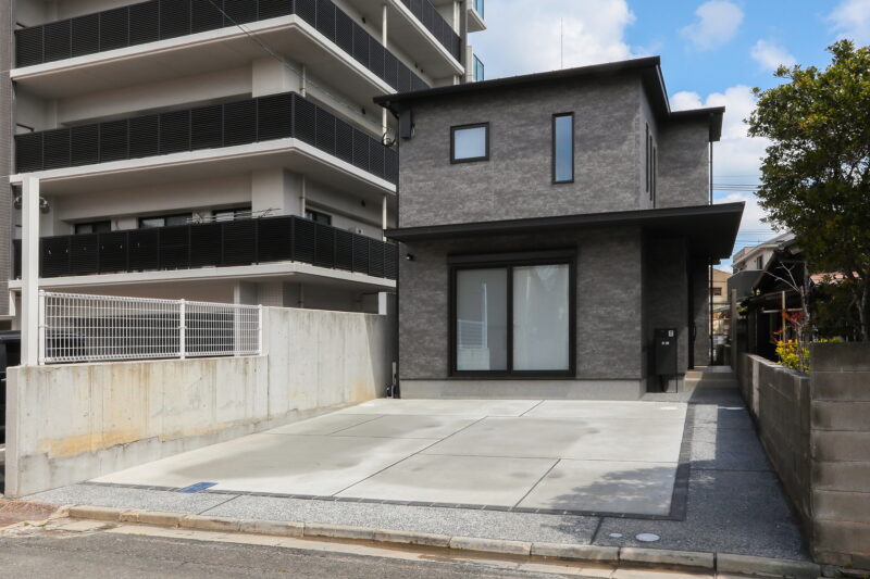 外壁と色味を揃えた、シンプルモダンな佇まいです。