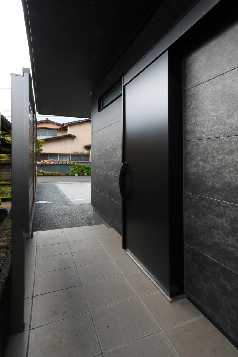 玄関はブラックの引き戸を採用。