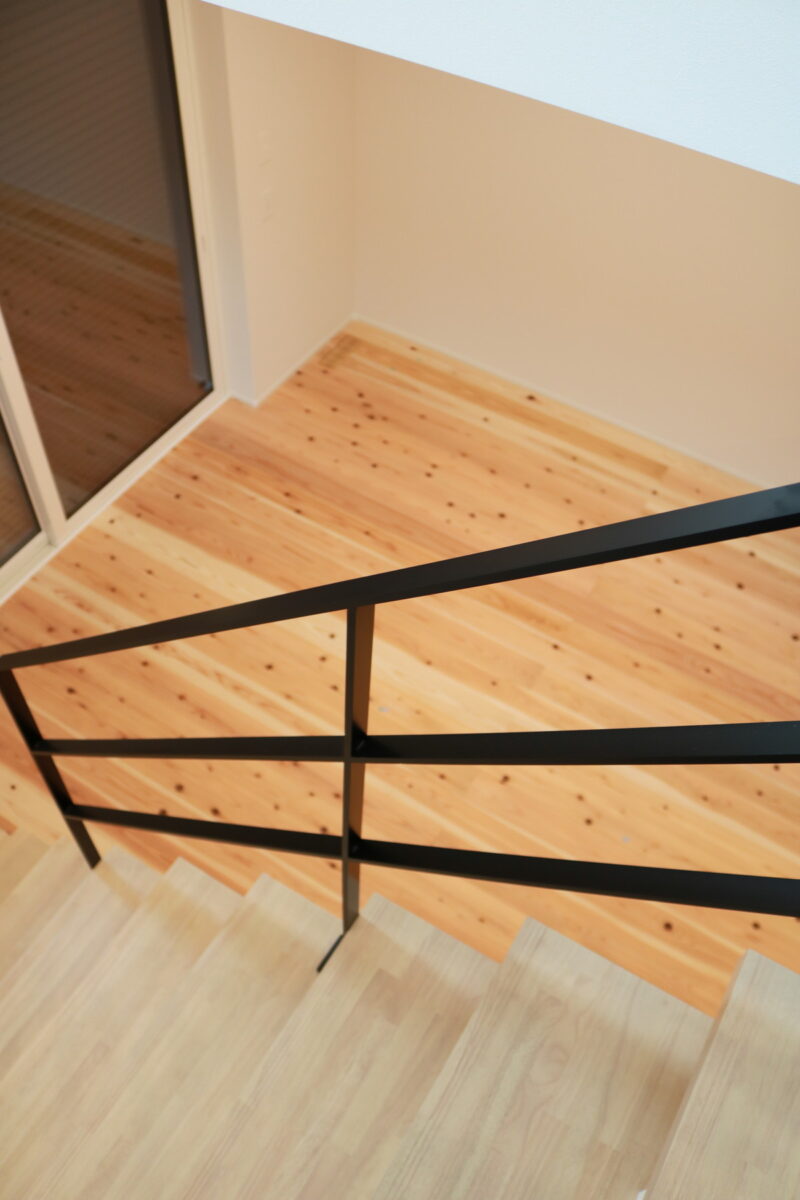 無垢床とアイアンが調和する、素材のコントラストを楽しむリビング階段。