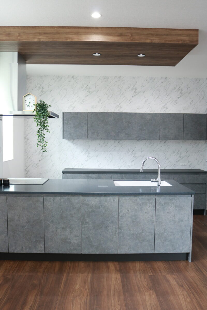 ストーン調のキッチンと壁面が調和する、グレイッシュモダンなキッチン空間。