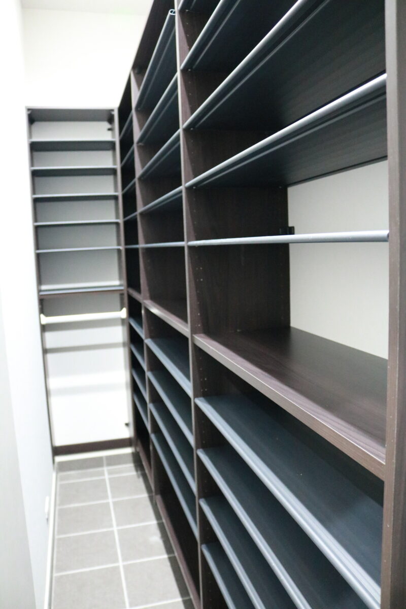ご家族全員の靴を収納できるよう、上から下まで棚を設け、奥行きもしっかり確保した収納力の高い空間です。