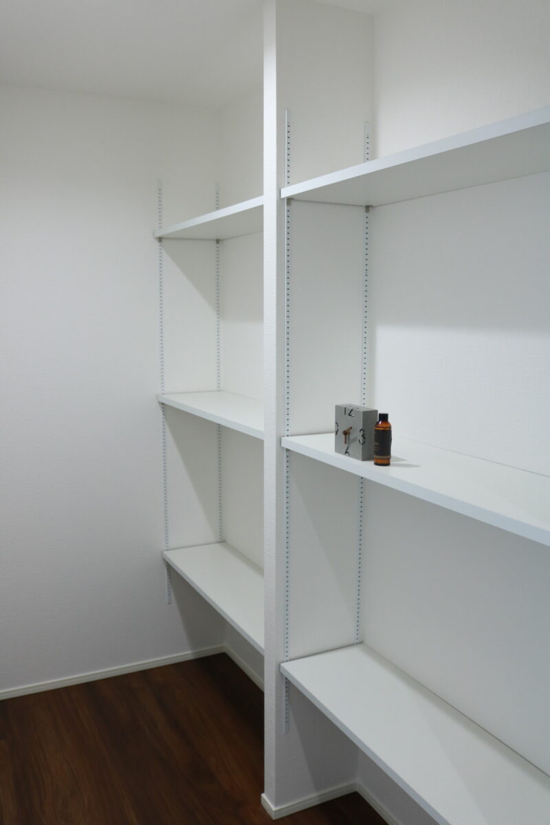 2階廊下には収納棚を設置。